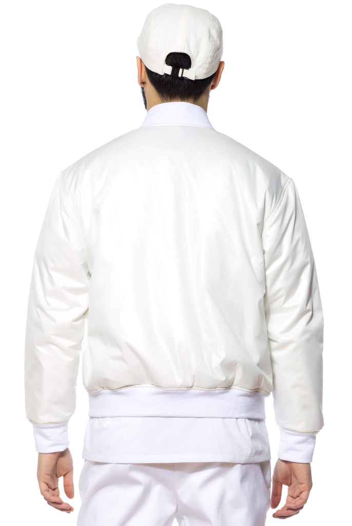 Your print will cover the front and back of the bomber jacket / The backside will mirror the front / You can select either black or white for the collar, cuffs, hem, zipper and lining/ This jacket features PAOM straps inside / Body is 100% nylon, lining is 100% nylon, ribbing 100% cotton / Made in our studio (Shanghai).